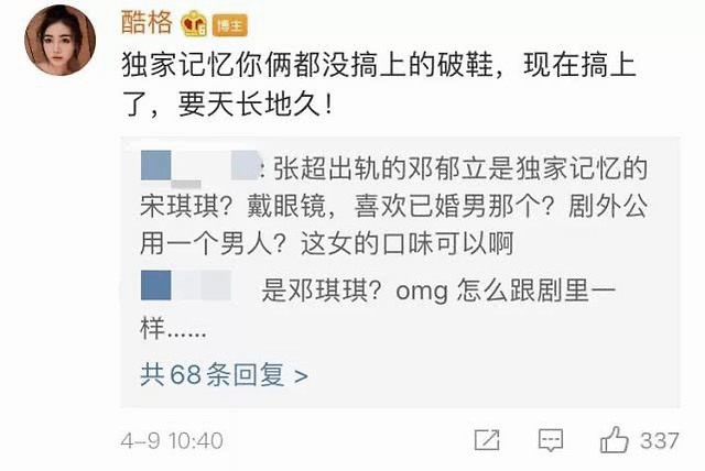 根据赵格格的说法,两人当时在戏里还没有在一起,戏外才在一起的。之后赵格格联系到了邓郁立,邓郁立也大方承认了自己在和张超交往,但是完全不知道张超还有女朋友,所以邓郁立是被三了。