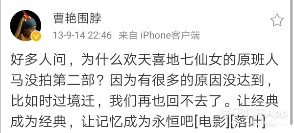 挺多观众都希望《欢天喜地七仙女》拍第二部,不过曹艳说过因为很多原因不满足拍续集的条件,首先演员的状态就已经回不去了。