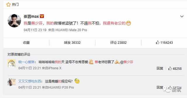 蔡少芬微博被卖衣服的微商盗号,上老公张晋微博澄清时,顺带撒了一波狗粮。