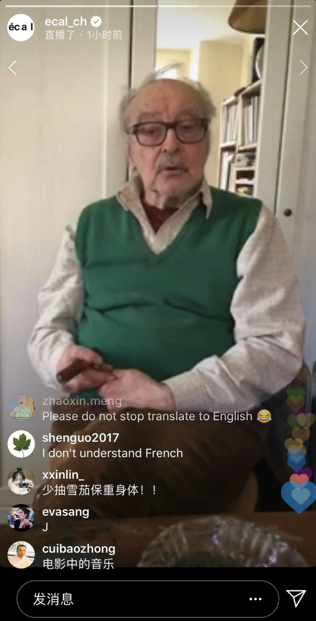 所以,如此混杂的语言将这场直播变成了影迷们的狂欢,有中国网友在淘宝上发现了戈达尔的同款绿色毛织坎肩,纷纷留言“买起”;也有很多网友对“法国新浪潮教母”阿涅斯·瓦尔达在纪录片《脸庞、村庄》中去拜访隐居在瑞士小城罗尔的戈达尔,却吃闭门羹一事耿耿于怀,留言:“为什么之前没有给阿涅斯·瓦尔达开门?”。于是,戈达尔的侃侃而谈与网友们的评论形成一种有趣的错位,各聊各的,并且不亦乐乎。