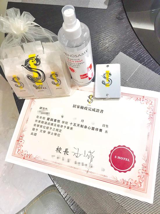 证书上,除了居家检疫者的头衔成了"研究生",并写着"在本校爱与喜悦学院15天制身心灵修养系修业期满成绩及格准予毕业...",让她觉得温馨有趣。除了证书,女同学还收到一袋内含凤梨酥、1瓶75%酒精及行李牌的礼物。她住15晚,每天6000台币(约1400人民币)含3餐,共花9万台币(约2万人民币),饭店工作人员每天会打电话关心身体健康状况。