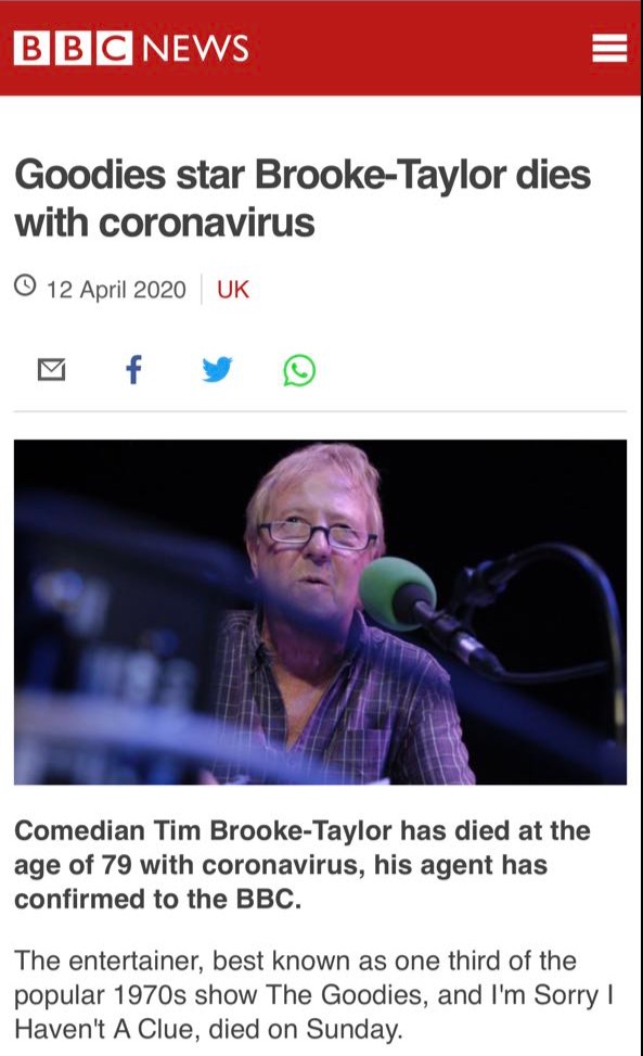 据港媒报道,4月12日,英国老牌喜剧演员蒂姆·布鲁克·泰勒(Tim Brooke-Taylor)传来死讯。其经理人证实布鲁克·泰勒因感染新冠肺炎于病逝,享年79岁。