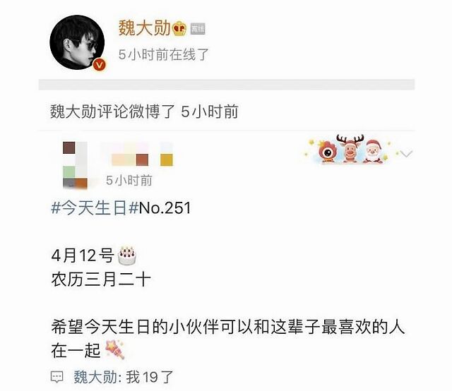 据一床情书了解,4月12日是魏大勋生日,他在一条恋爱相关话题的微博下评论称:“4月12日,农历三月二十,希望今天生日的小伙伴可以和这辈子最喜欢的人在一起”,疑似暗恋自己跟喜欢的人在一起了,随后他还写道:“我19了”,疑似与他19岁时曾在个人社交网站上表白过杨幂有关。