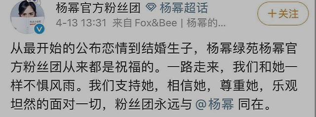与此同时,杨幂官方粉丝团也在杨幂超话发文表示,无论遇到什么事都会支持杨幂,与她一路同在,网友猜测这是粉丝团针对杨幂与魏大勋恋情公开表态。