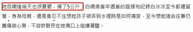 白冰冰也透露自己的近况,被网络黑子重提伤心事,她很忧郁,短短几天就瘦了5公斤,女儿当年受害的证据和影像她到现在还留着,身为母亲总是会想女儿惨遭毒害去世时的痛苦。