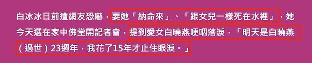近日白冰冰遭到网友的恶评恐吓,要她“拿命来”、“和女儿一样死在水里。”今日她在自家佛堂召开记者会,表示:“明天是白晓燕(过世)23周年,我花了15年才止住眼泪。”