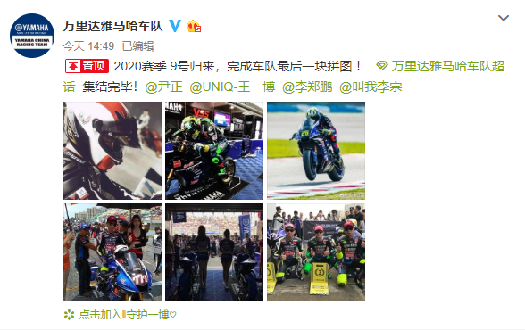 4月13日,某车队在官方账号发文表示:“2020赛季9号归来,完成车队最后一块拼图 !车队集结完毕!”并@尹正、王一博及其他车手,宣布尹正和王一博在2020赛季的回归,引发众粉丝的期待。