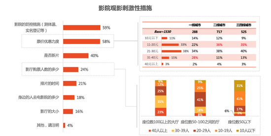 在影院恢复营业初期,接近六成受访者认为“影院的防控措施(测体温、实名登记等)”和“票价的优惠力度”会增加自己看片的冲动,还有四成认为“是否是新片”也是重要驱动因素。