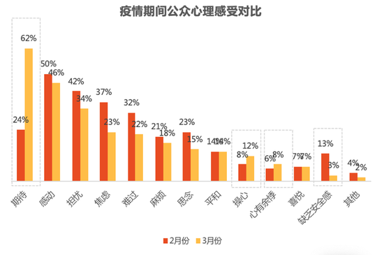 经过两个月的抗疫,公众对疫情结束的“期待”提升显著,位列3月份公众心理感受首位,焦虑、担忧、难过等情绪均有所下降,随着各地各行各业陆续复工复学,防范和担忧心理尚未完全消除,但总体积极乐观,“安全感”也上升了10%。