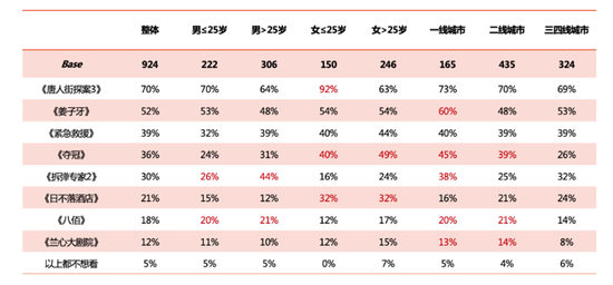 一二线城市观众对国内新片上映期待度更高。根据调研结果来看,春节档影片热度未减,在可接受4月份去影院观影的人群中,想看国内影片排名前四位均为春节档电影,依次为《唐人街探案3》《紧急救援》《姜子牙》和《夺冠》。