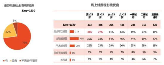 在票价上,八成以上受访者对30元以下的票价接受度较高,尤其是21-30元的价格区间接受度较高。从不同城市来看,一线城市对“31-40元”、低线城市对“11-20元”的接受度更高。