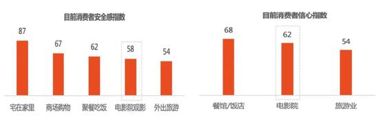 在消费安全感上,受访者对“宅在家里”的安全感最高(87分),其次为“商场购物”(67分)、“聚餐吃饭”(62分),“电影院观影”得分为58分,“外出旅游”最低。在消费信心上受访者对电影院消费的信心得分为62分。总体上看,公众对影院观影的安全感和信心低于餐饮业,但高于旅游业。