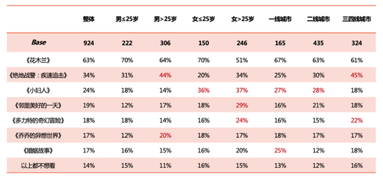 年长观众对国外新片的兴趣度更高。在可接受4月份去影院观影的人群中,想看国外新片排名前三位依次为《花木兰》《乔乔的异想世界》和《绝地战警:疾速追击》。从所给出的国外新片片单喜好度来看,年长观众对国外新片喜好度更高。