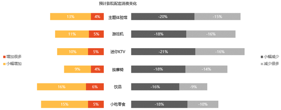 同时,影院配套消费预计在影院营业初期会受到一定影响。从调研结果来看,受访者对影院的配套娱乐设施的消费预期,如游戏机、迷你KTV、按摩椅等均会有一定程度的减少。