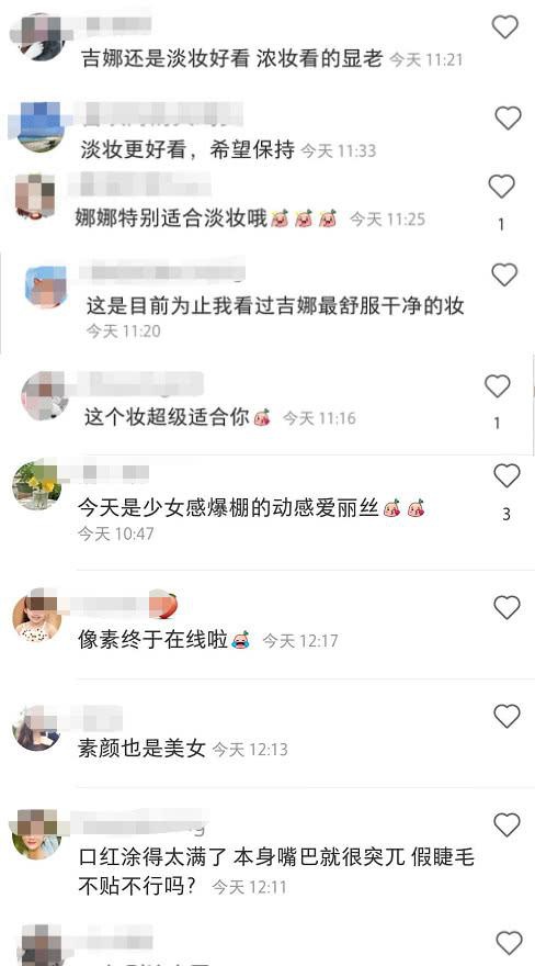 网友看到吉娜这次的妆容也纷纷留言:“淡淡的就很美了”、“淡妆真的很美很青春”,然而也有网友称“口红别涂太厚”、“口红涂太满了,本身嘴巴就很突兀,假睫毛不贴不行吗”、“上嘴唇不画出来就更好了”。