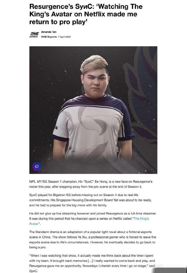 据悉,Sync曾获得过MPL-MY/SG(mobile premier league)第一季冠军,后因家庭原因离开职业赛场。偶然的机会他看到了电视剧《全职高手》,表示“看这部剧的时候经常会想起和队友在一起的种种,唤起很多美好回忆,我真的很想重返职业赛场”。网友看到后纷纷留言称:“好励志,这才是演一部剧的真正意义。”
