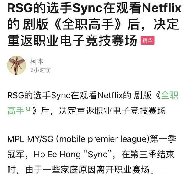 据外媒报道,RSG(RSG电子竞技俱乐部)选手Sync在看了Netflix的剧版《全职高手》后,决定重返职业电子竞技赛场。