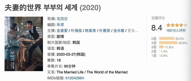 不过让人好奇的是,《夫妻的世界》一共16集,体量要比英剧的两季大很多,那么多出来的时长将怎么填充,会加入怎样的改编情节,对此我还是非常好奇的。