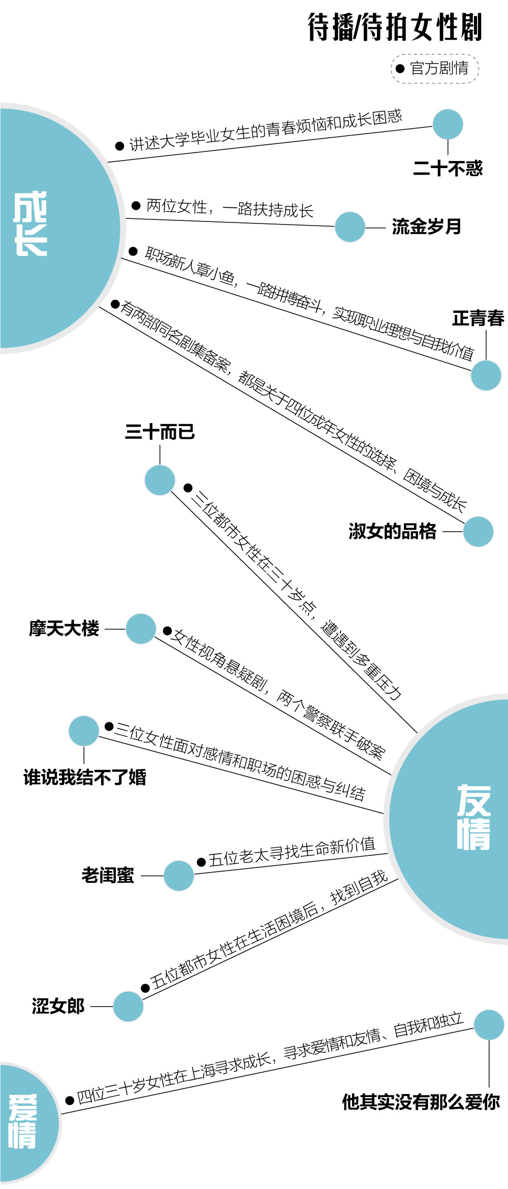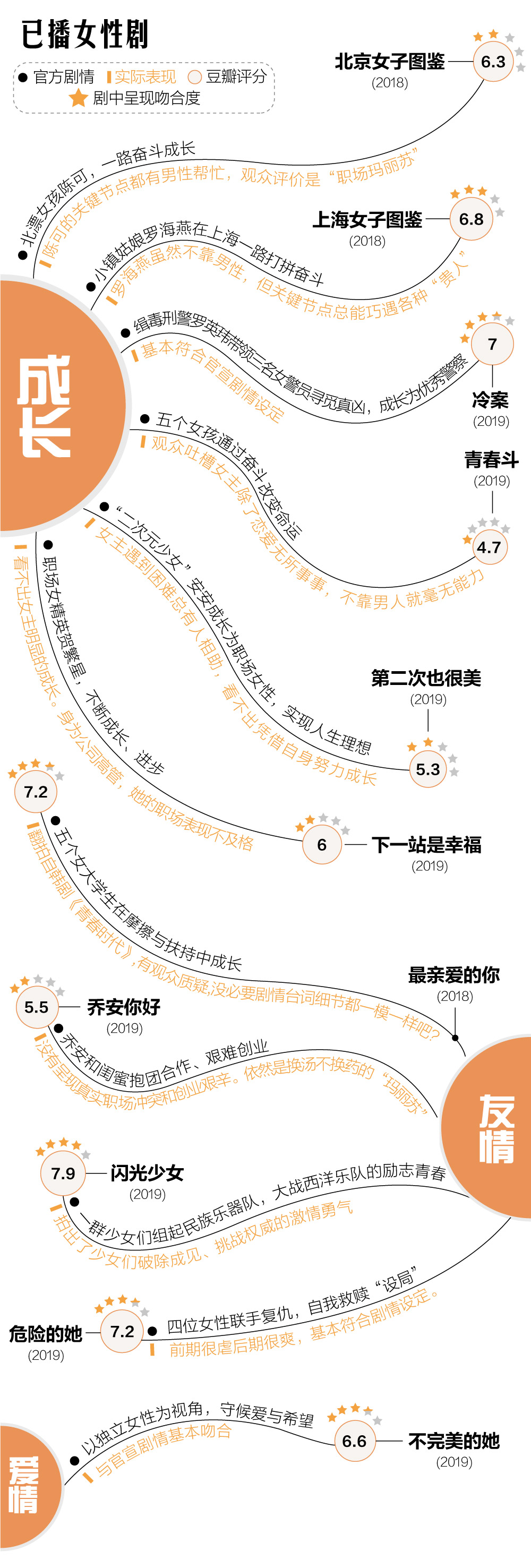 新京报记者统计了2018年、2019年、2020年播出的国产现实题材女性剧,获得较高关注度的只有十多部。其中2018年播出的有3部,其中两部是呼应日剧《东京女子图鉴》的《北京女子图鉴》和《上海女子图鉴》;2019年播出的有5部,包括了赵宝刚导演、郑爽主演,豆瓣评分4.7的《青春斗》和豆瓣评分7.9的《闪光少女》;2020年播出了《下一站是幸福》《危险的她》和《不完美的她》。