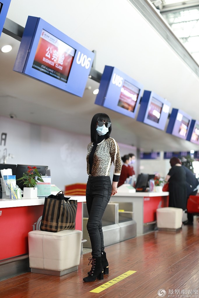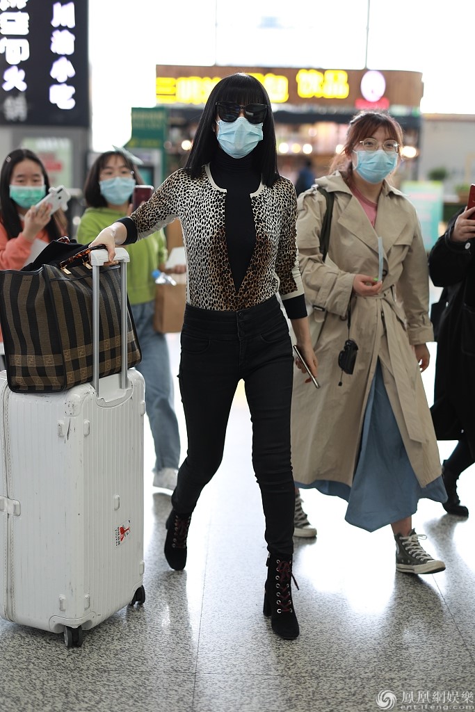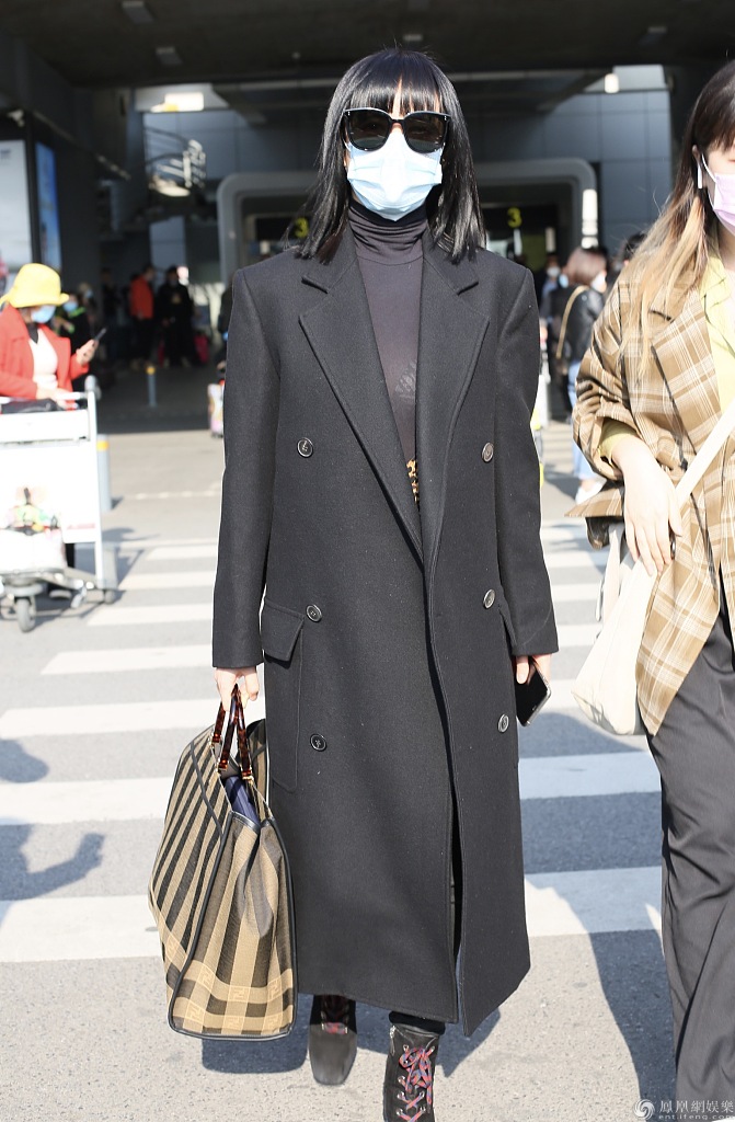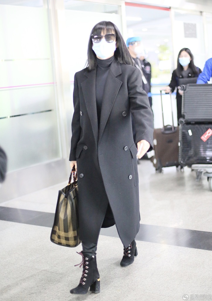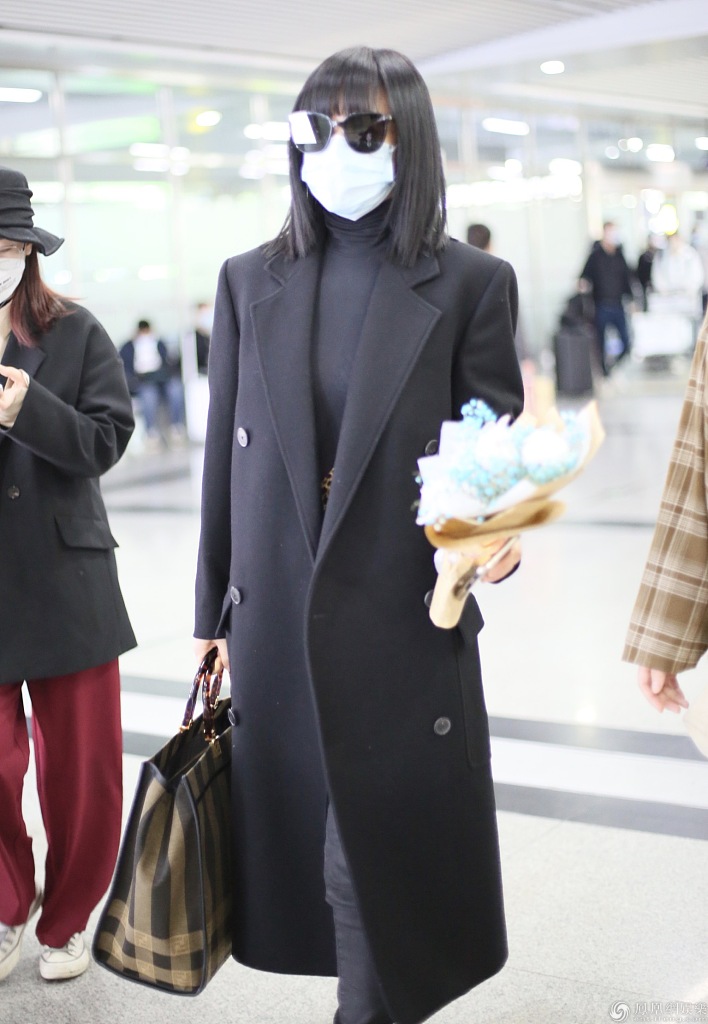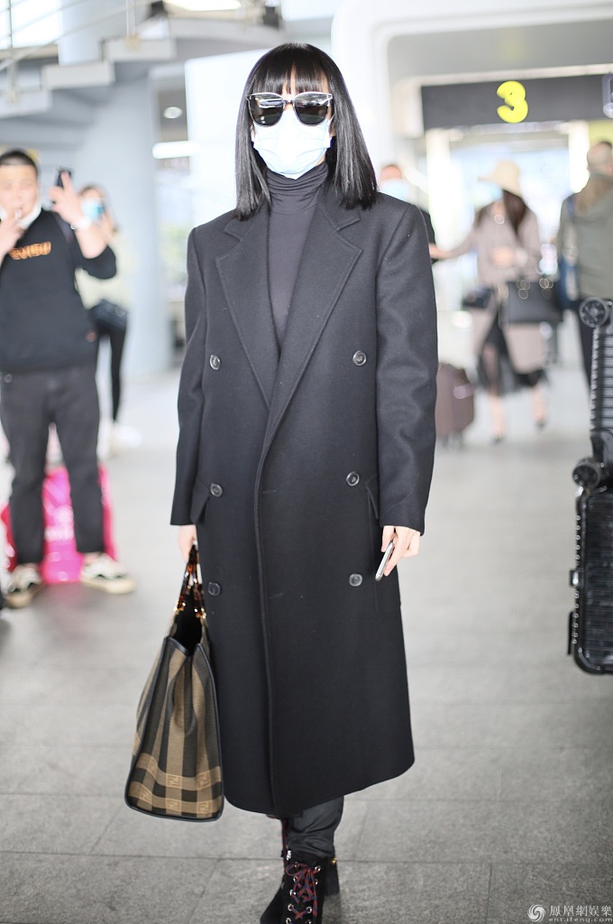 同一天,谭卓现身长沙机场,穿黑色大衣酷劲十足。