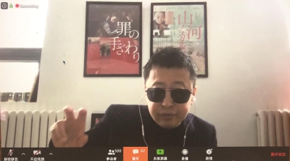 “各位同学,大家好,很高兴通过网络,我们能够交流电影。”昨天下午两点,一袭黑衣,戴着墨镜和耳机,著名导演贾樟柯准时出现在屏幕里,身后是两张电影海报和导演北京工作室颇具辨识度的两排暖气片。