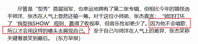 但也有人否定他。比如和他一样是回锅肉,参加快男后火了的张杰,看了师洋的表演后发博客表示不理解。