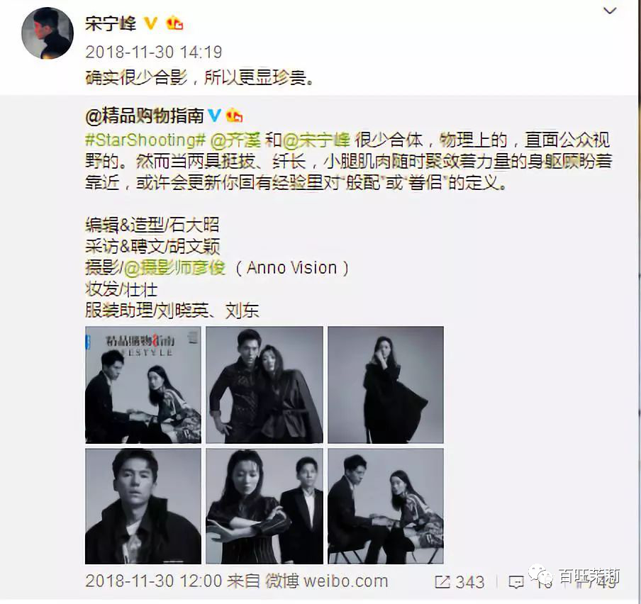 18年11月底,宋宁峰还以“眷侣”身份接受时尚杂志《精品购物指南》的拍摄采访。