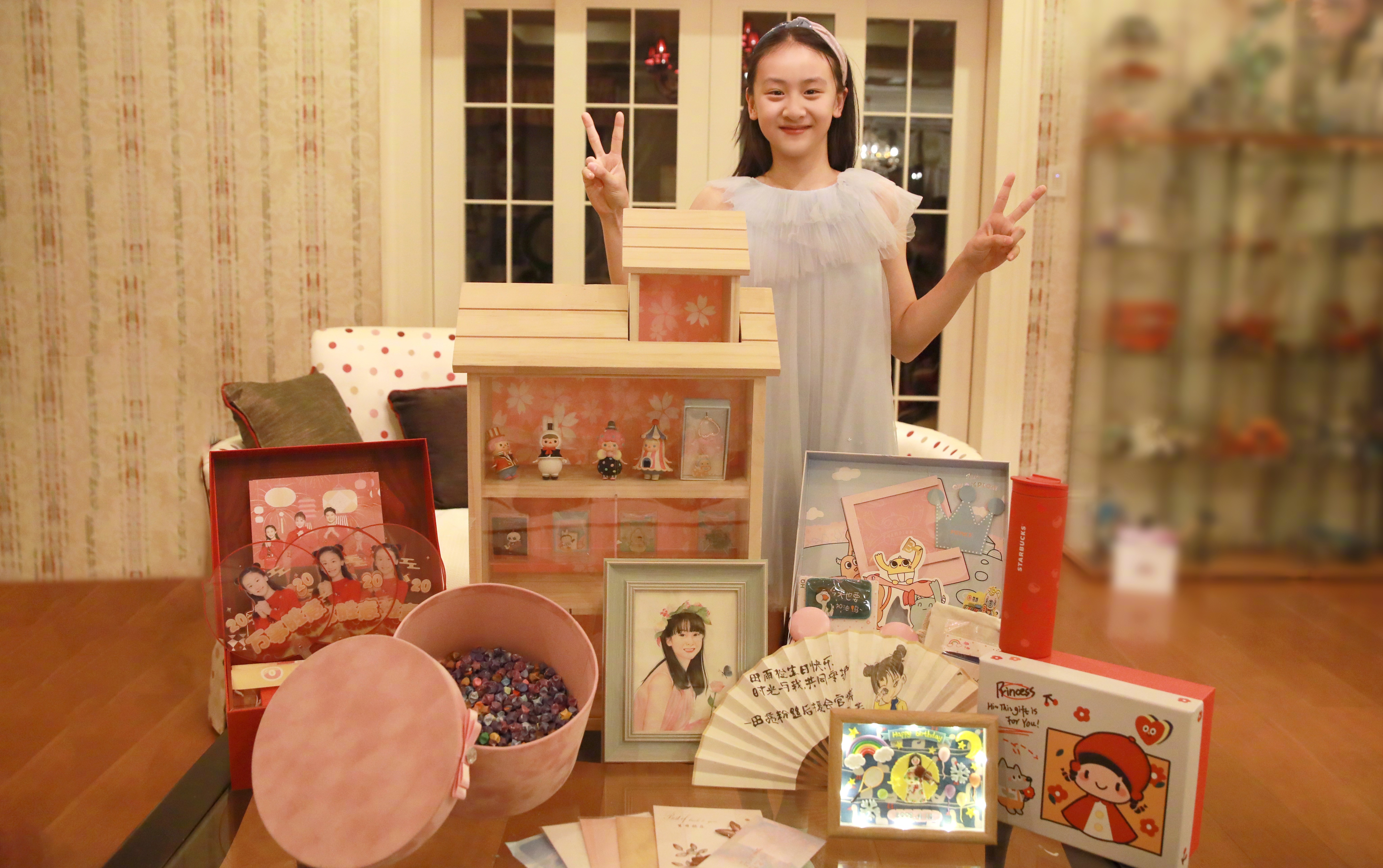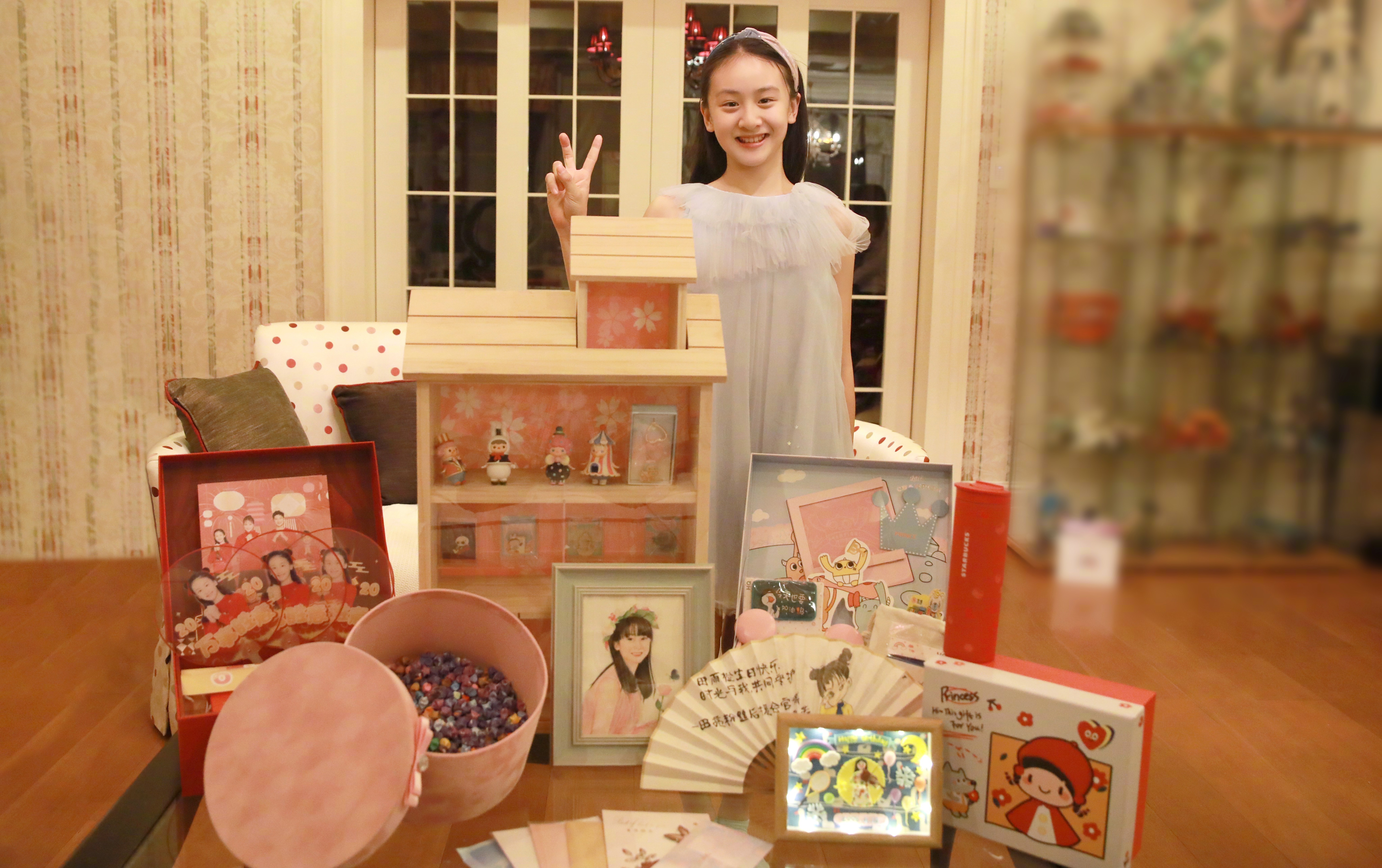 照片中,森碟头绑发带,穿着灰蓝色纱裙和礼物合影,开心比耶。