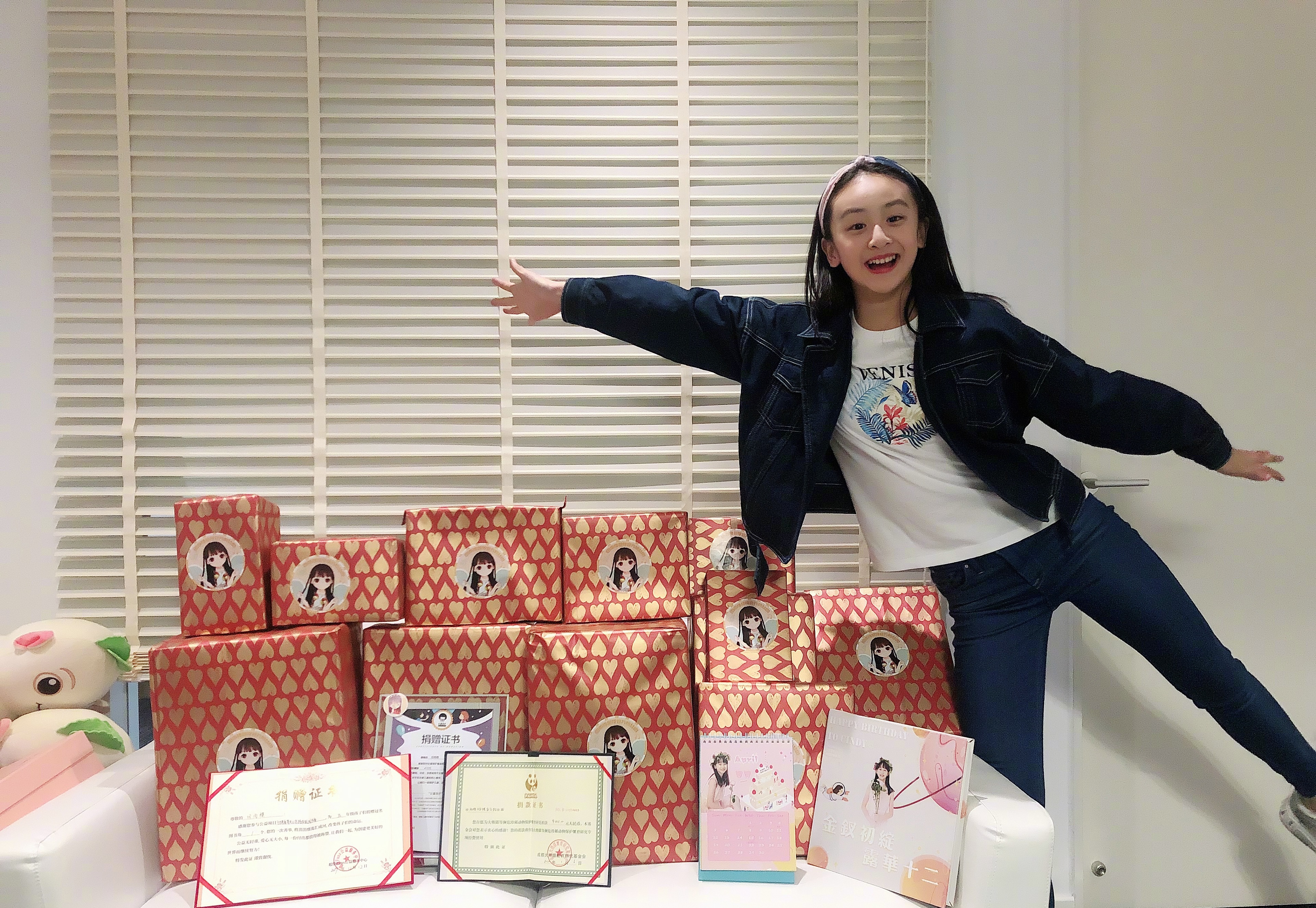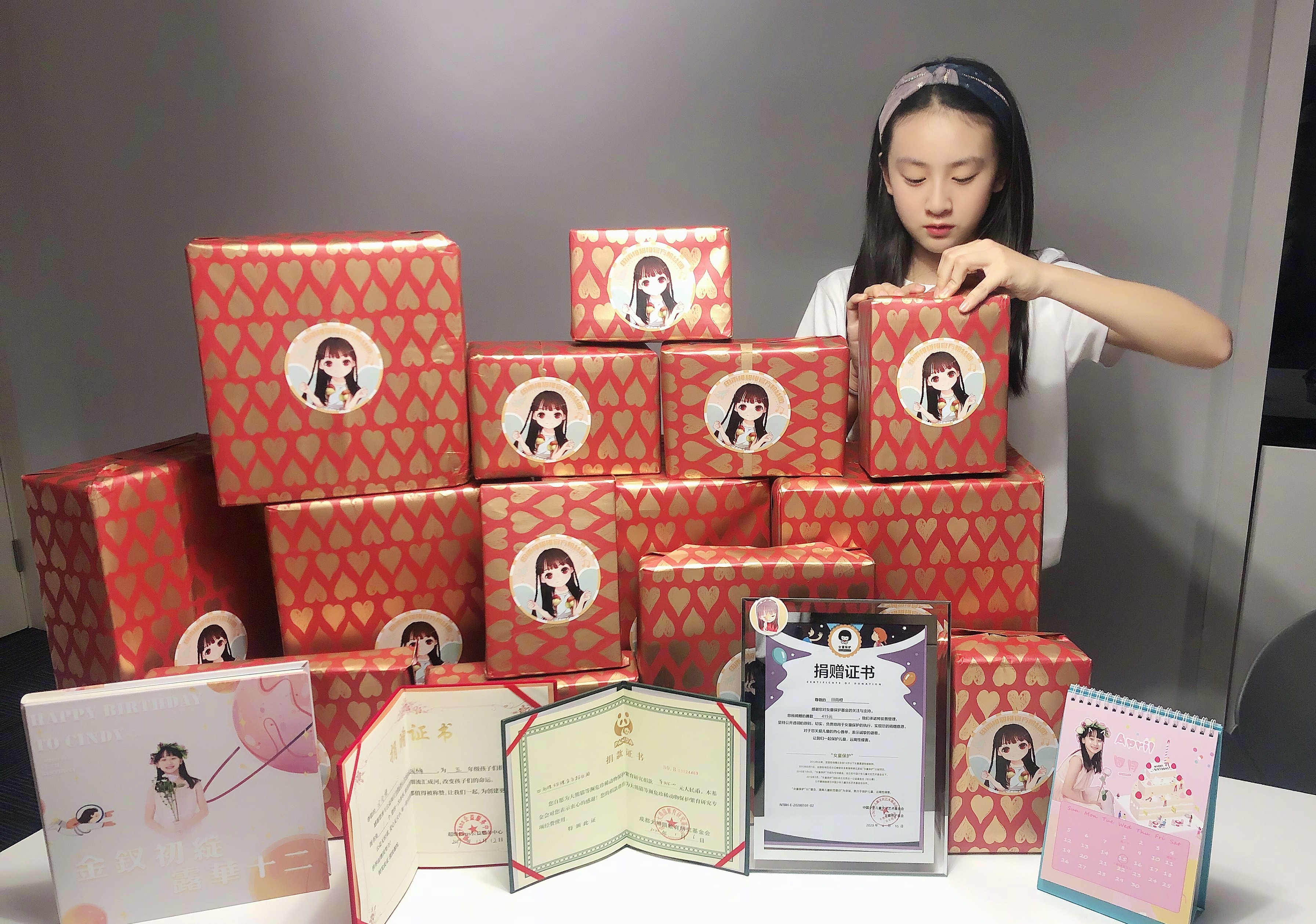 另一组照片中,能看到森碟收到了很多礼物,大大小小十几个盒子,还有几张捐赠证书,想必是粉丝以森碟的名义进行的捐赠。