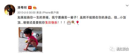 一次是在综艺《天天向上》,汪涵念了一条潘粤明的微博,是祝儿子顶顶4岁生日快乐的: