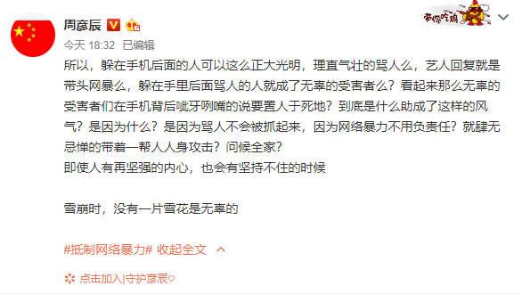 4月15日,卜凡喊话黑粉约见面登上热搜。晚间,曾和卜凡一同参加《偶像练习生》的周彦辰在社交平台发文,疑似为卜凡发声:“躲在手机后面的人可以这么正大光明,理直气壮的骂人么,艺人回复就是带头网暴么,躲在手(机)里后面骂人的人就成了无辜的受害者么”?文末他表示:雪崩时,没有一片雪花是无辜的。