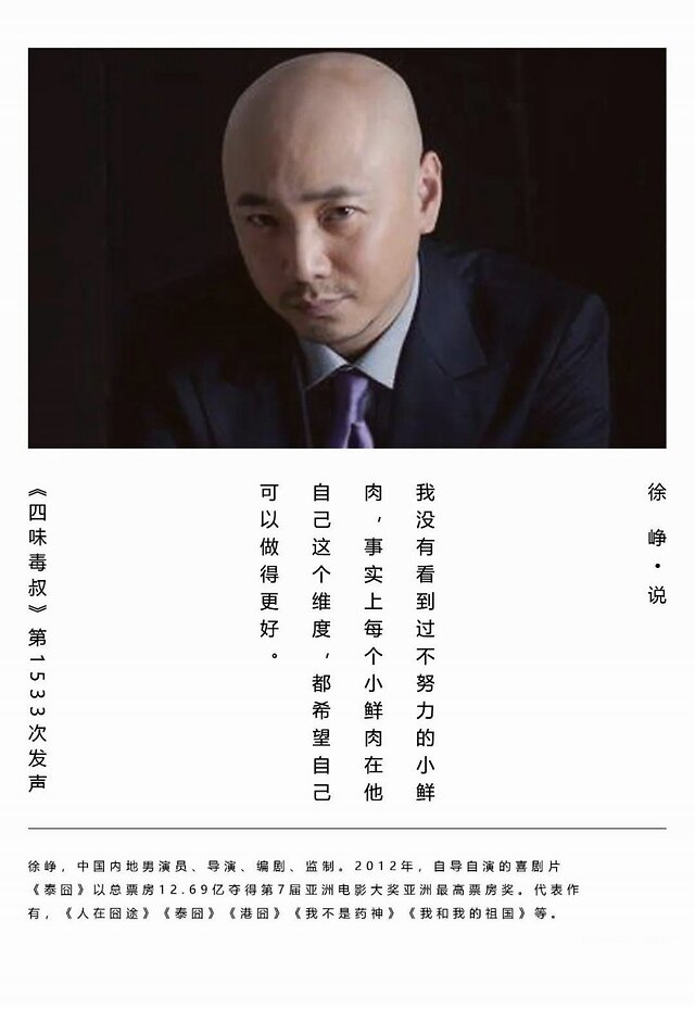 徐峥:以我的观察来看,我没有看到过不努力的小鲜肉。事实上每个小鲜肉在他自己这个维度,都希望自己可以做得更好,都希望自己可以有突破。那也就是说在背后有另外一个状况,就是说我们好像把两个不同的系统给搅到了一起去。因为在我看来,所谓“小鲜肉”是原先在韩国、日本,他们所形成的这样一种偶像文化。他们把年轻人划分出,在当中挑选出有一部分培训他们。据我所知,这种培训是一种军训似的,是非常艰苦的一种训练。我听上去都瞠目结舌,每天就睡那么几个小时,很早就爬起来,然后做体能训练,各方面都有训练,我想这么做一定是有背后的原因。我的理解是说让他提前适应一种制度,在这种秩序里面去体验“吃得苦中苦,方为人上人”,因为后面他们马上就要做人上人了。所以他的身体,他的心理,他整个的抗压能力,都得做好那样的一个准备。因为你马上就会面对各种各样的情况,这个训练系统,这样的打造,打造完了以后会有一系列的工作是围绕着我们精心训练出来的这些特殊的年轻人,然后发展成为整个的一个粉丝经济、粉丝文化,从而产生一种追星的效应,以及带动各种消费,然后形成了这么一个系统。因为我很小就做演员了,那么我所知道的演员好像应该是另外一个系统,比如说我是学舞台剧的,那么作为演员来讲,首先是挑出来的人才能做演员,不是说每个人都能做演员。