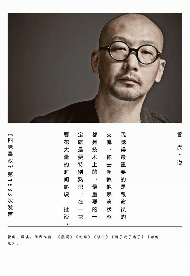 管虎:我觉得最重要的是跟人的交流,你去调教他什么表演状态都是技术上的,这个人心它隔着呢,就是你没成朋友啊,就是一定要就是特别熟识,在一块要花大量的时间熟识,扯淡。
