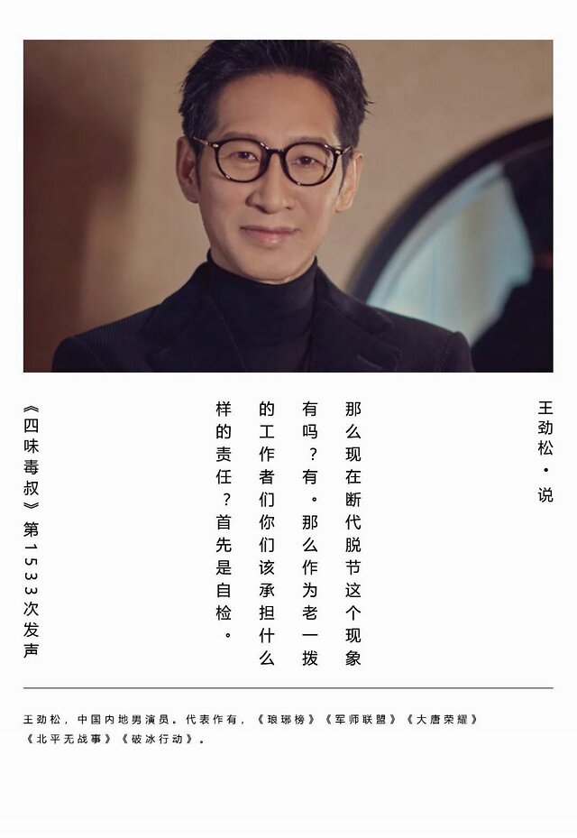 王劲松:是,我们把责任先揽过来,我们如何传、我们如何带,那么现在断代脱节这个现象有吗?有。那么作为老一拨的工作者们你们该承担什么样的责任?首先是自检。我们是不是传下去了,包括刘老师现在他也在带学生,他以前是好像没听说过他带,现在他开始带编剧什么的,可能看到了本行业的危机,所以他开始带学生,演员也是一样的,那么我们有没有把我们这些好的这些习惯传下去?告诉下一代人?其实是现在的这个节奏太快了,比如说我们一开始拍电视剧的时候,我记得我参加过一个戏,一共是八集电视剧,拍五个月。