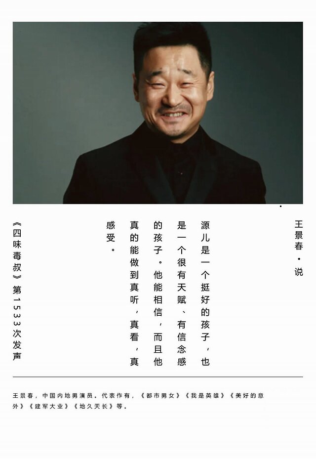 王景春:我们俩这个合作挺逗的,反正我用了一个招,一见面就收拾了他一下。因为一见面要演一个特别重要的戏,就是两个人对抗的戏,两个劲儿是拧着的,互相对着干的。他又是个乖乖仔,见人都特别客气,我知道他什么样。但当我知道他来了,我在楼上就是没下来。之后说拍戏了,我一下来,导演就介绍,我一看王源满脸堆着笑,我就看了他一眼,脸拉得很长,看了他一眼就走了。导演在介绍这是王老师,这是王源,结果我就走了。直接把他晾那儿了,完了导演也晾那儿了,张着大嘴,跟我在那儿哑着。