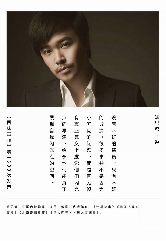 陈思诚:我觉得小鲜肉它不是一个褒义词,更不是一个贬义词。小鲜肉只是对你现在的生命状态的一种称谓,我还觉得我儿子是最小的小鲜肉呢,我儿子两岁,我觉得我儿子简直太嫩了,太鲜肉了,太可爱了我觉得。如果别人现在说我是小鲜肉我特别高兴,对吧?或者说我某部分很小鲜肉,所以我没有觉得大家对小鲜肉这个词有任何歧义,它只是对你认知的一种感受,对吧?当然,有会演戏的小鲜肉就一定有不会演戏的小鲜肉,这都很正常。