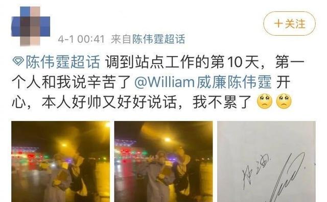 在接受检查的时候他还遇到了自己的粉丝,粉丝曾发文说:"调到站点工作的第十天,第一个人和我说辛苦了。"陈伟霆还给工作人员签名写道:"加油。"