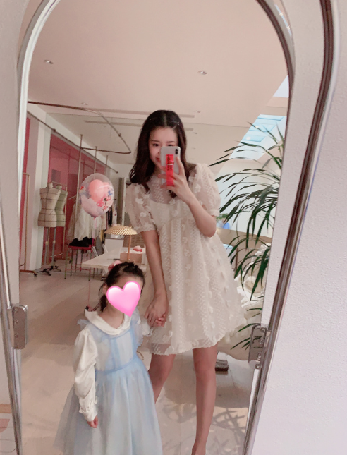 张子萱抱着小女儿笑容幸福,怀中的小女儿戴着粉红色蝴蝶结发夹,穿同色连衣裙,露出的小脸白嫩可爱。