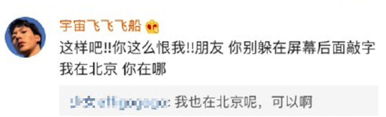 随后,卜凡评论其动态,称“这样吧!!你这么恨我!!朋友 你别躲在屏幕后面敲字 我在北京 你在哪”。随后黑粉回复称,“我也在北京,可以啊”。