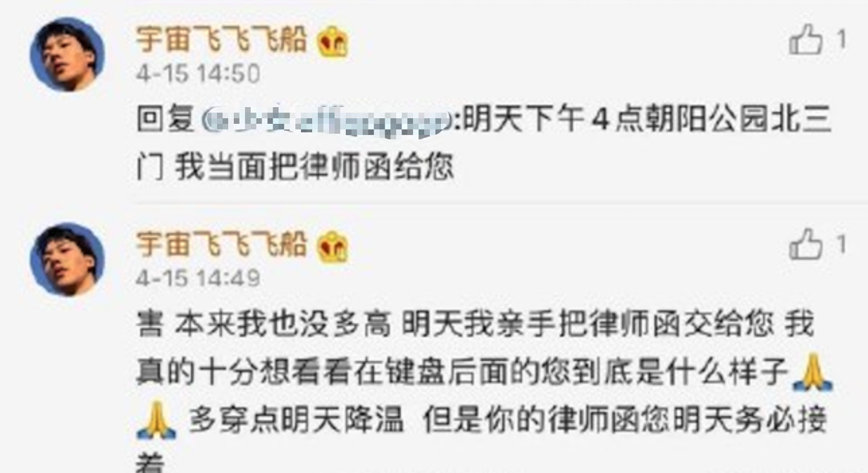 卜凡随即放话称,“明天下午四点朝阳公园北三门见面”,欲亲手向对方递交律师函。“害 本来我也没多高 明天我亲手把律师函交给您 我真的十分想看看在键盘后面的您到底是什么样子 多穿点明天降温 但是你的律师函您明天务必接着。”