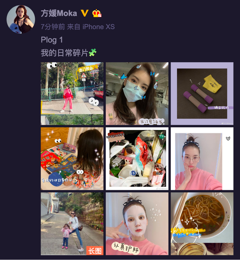 4月15日,方媛分享日常,并配文:“Plog 1,我的日常碎片