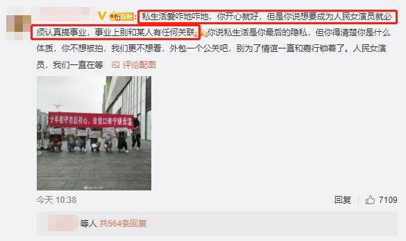 只见热评第一写道:“私生活爱咋地咋地,你开心就好,但是你说想要成为人民女演员就必须认真搞事业,事业上别和某人有任何关联。”