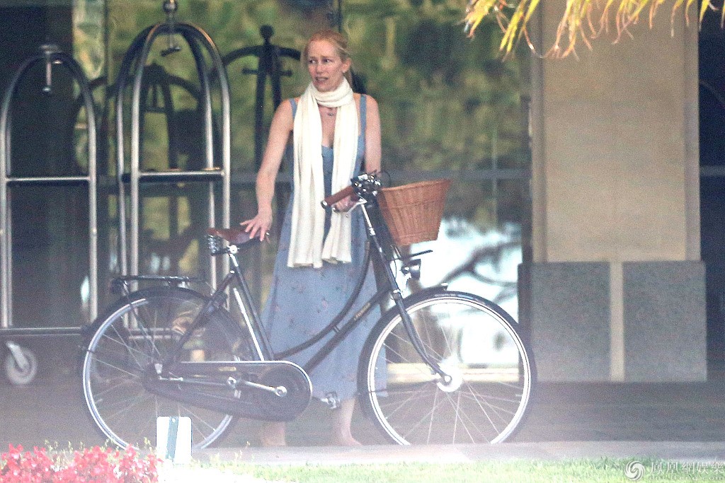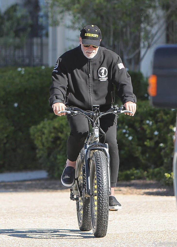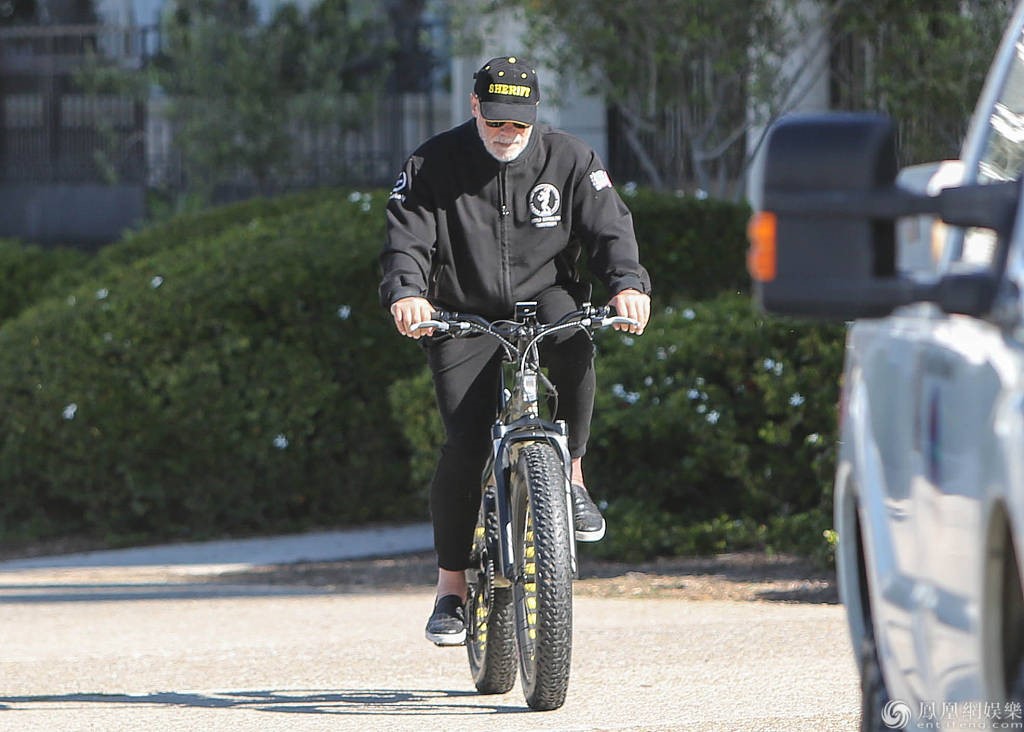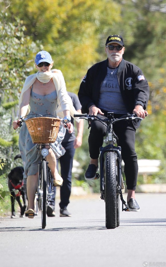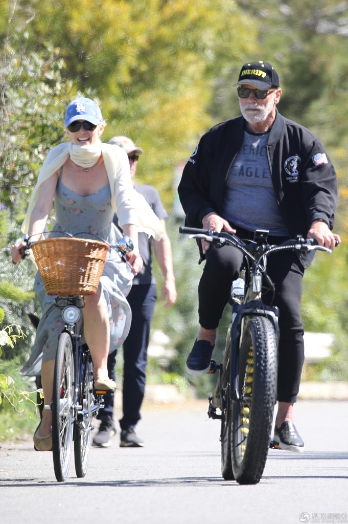 施瓦辛格穿一身黑戴墨镜帽子单手骑车,在女友面前尽显男人味,45岁希瑟穿碎花裙面露灿笑,陪伴出行。