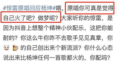 随后更是喊话杨坤:“《惊雷》比你任何一首歌都火,是不是爱听的人都是脑瓜子有毛病?”