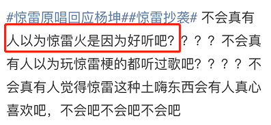 说白了,火的不是歌,而是“惊雷”这个概念本身。而杨坤用“旋律”“节奏”等音乐要素去衡量它的艺术价值,完完全全就是“降维打击”。