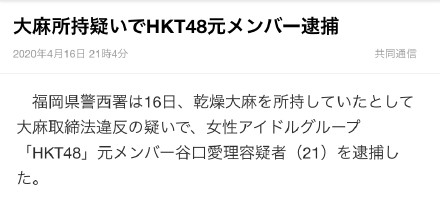 4月16日晚,据日媒报道,福冈县警西署以携带干燥大麻违反大麻取缔法的嫌疑逮捕了女性偶像组合HKT48的原成员谷口爱理(21岁)。