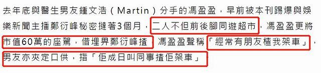 帮买房却惨遭分手,男方火速另结新欢,恋上成熟辣妹,冯盈盈因此也遭到港媒的嘲笑。不过近日,冯盈盈也展开了一段新恋情,她被媒体拍到与新闻主播郑衍峰前后脚同游超市,冯盈盈更将市值60万港币(约55万人民币)的座驾借给郑衍峰当代步工具。