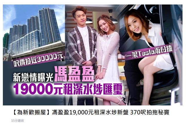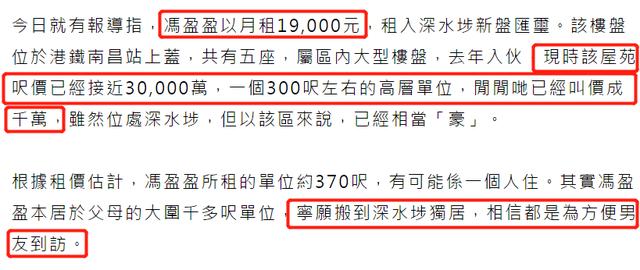 现更有报道指,冯盈盈已经从父母的住处搬离出来,以月租19000(约17500)的价格租下了深水埗的一栋豪宅,去年该房屋的房价已经接近30000万港币(约2千7百万人民币)冯盈盈所租的房子面积约370呎,现在市值高达上千万,她宁愿花大价钱租位置较偏的千万豪宅,相信都是方便与男友约会吧!
