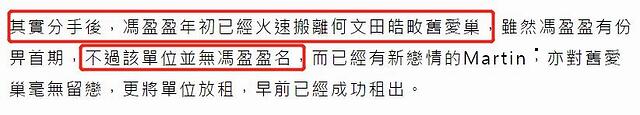 去年分手后,冯盈盈火速搬离爱巢,与父母同住。而已经有了新恋情的Martin也毫不念旧,随后就将房子放租,早前已经成功租出。