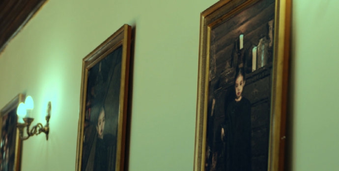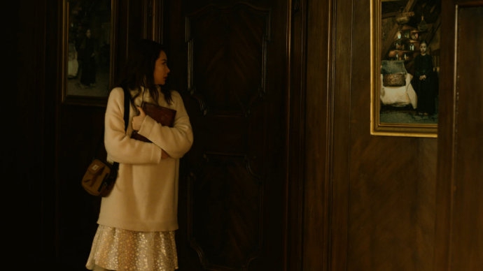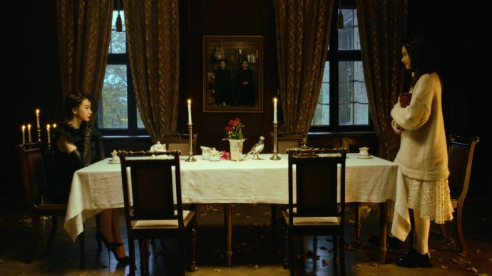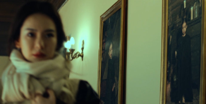 Lucky穿着戚薇同款哥特风小礼裙出现在了墙上的画中,小大人的模样看起来很端庄。